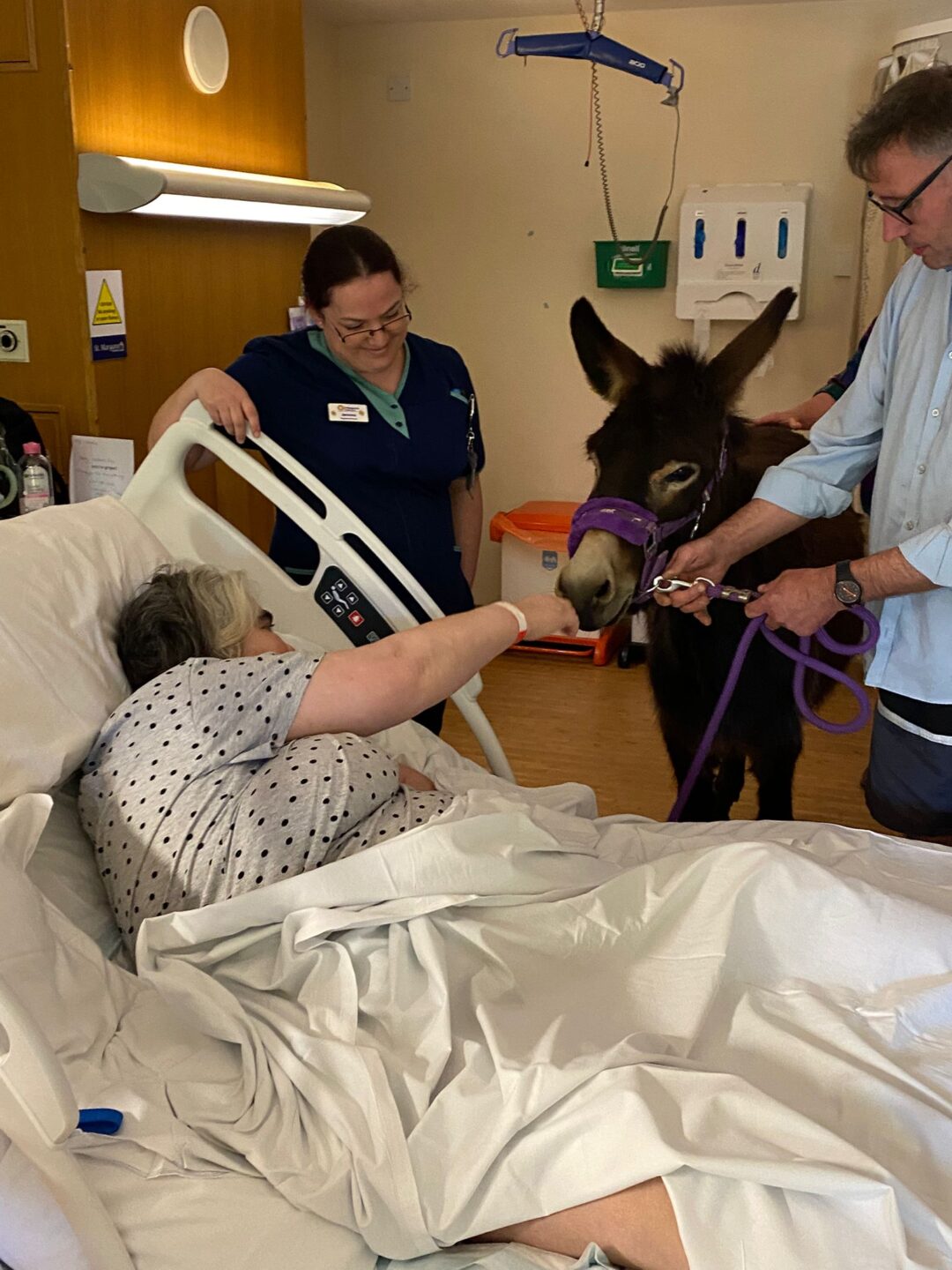 But one moment in particular captured the hearts of everyone – even beyond the hospice. Jackie had often spoken of the joy she found during family trips to the Donkey Sanctuary in Sidmouth. One day, she mentioned she’d love to give a donkey a back scratch.