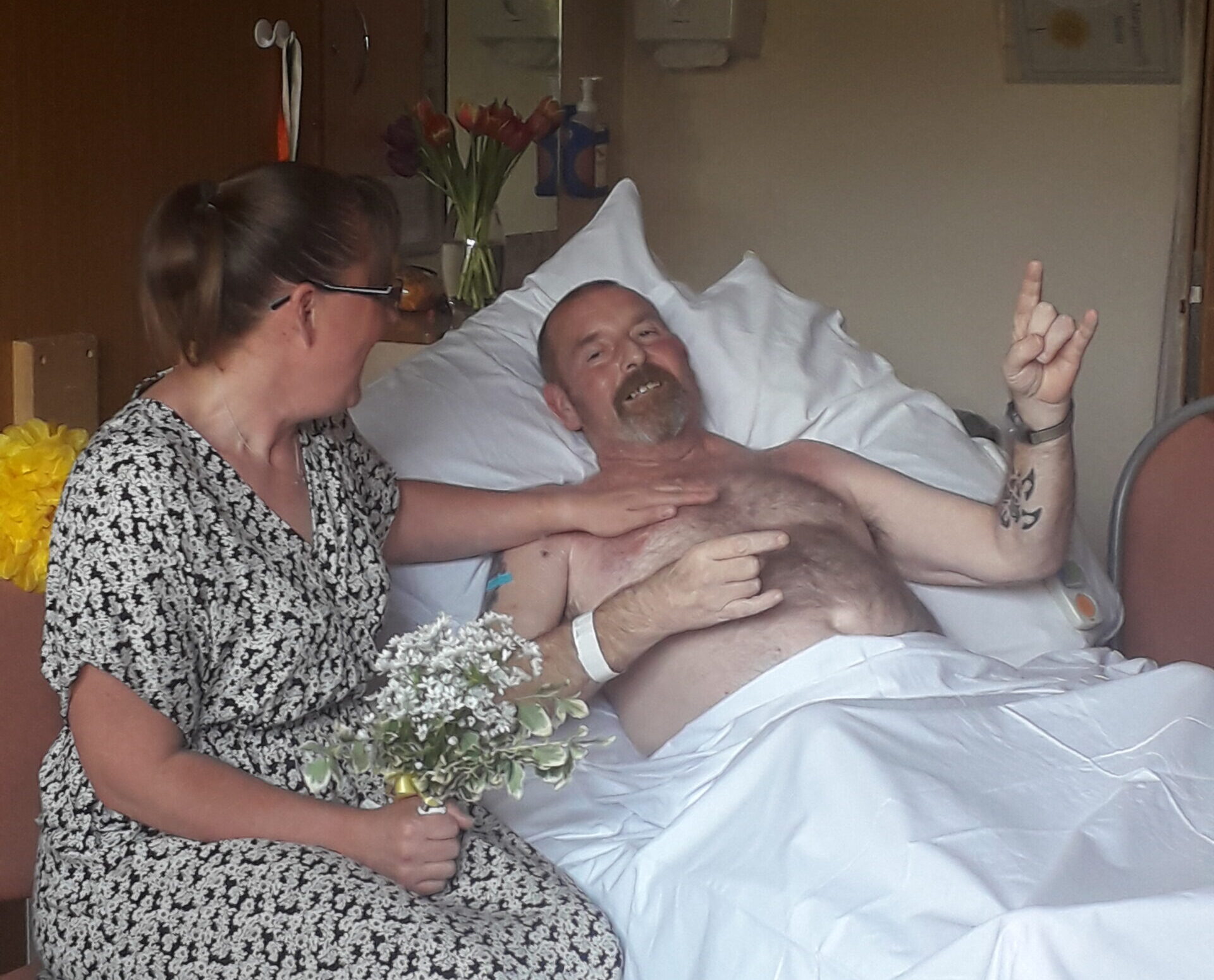 With the help of the nursing team – a cuddle bed was moved into their room which was decorated with pretty yellow bunting, Ann, the Spiritual Care Lead, helped the couple get a license for an emergency wedding, as well as a registrar to perform the ceremony. A flower arranging volunteer was due to arrange flowers and a bouquet for Kath, and the catering team prepared a wedding cake. Sadly, Rob’s condition deteriorated and the wedding that was planned for Monday was moved forward to Saturday afternoon. The whole team stepped up to bring forward all the arrangements by two days in a matter of hours.